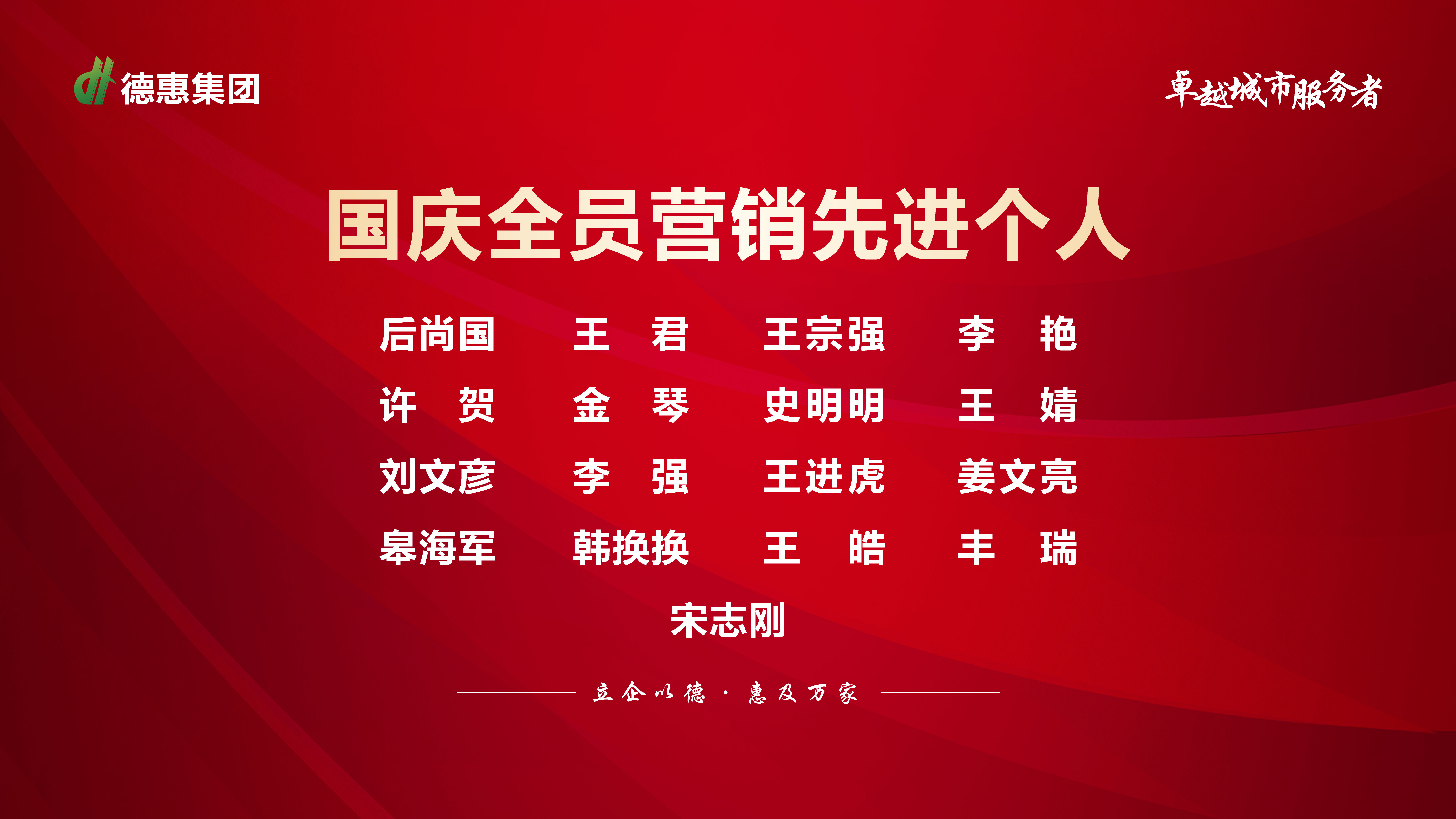 隨后,為樹立標桿,表彰先進,集團對國慶黃金銷售期中業績明顯、思想站位高、解決問題能力強的17位全員營銷先進模范進行表彰。