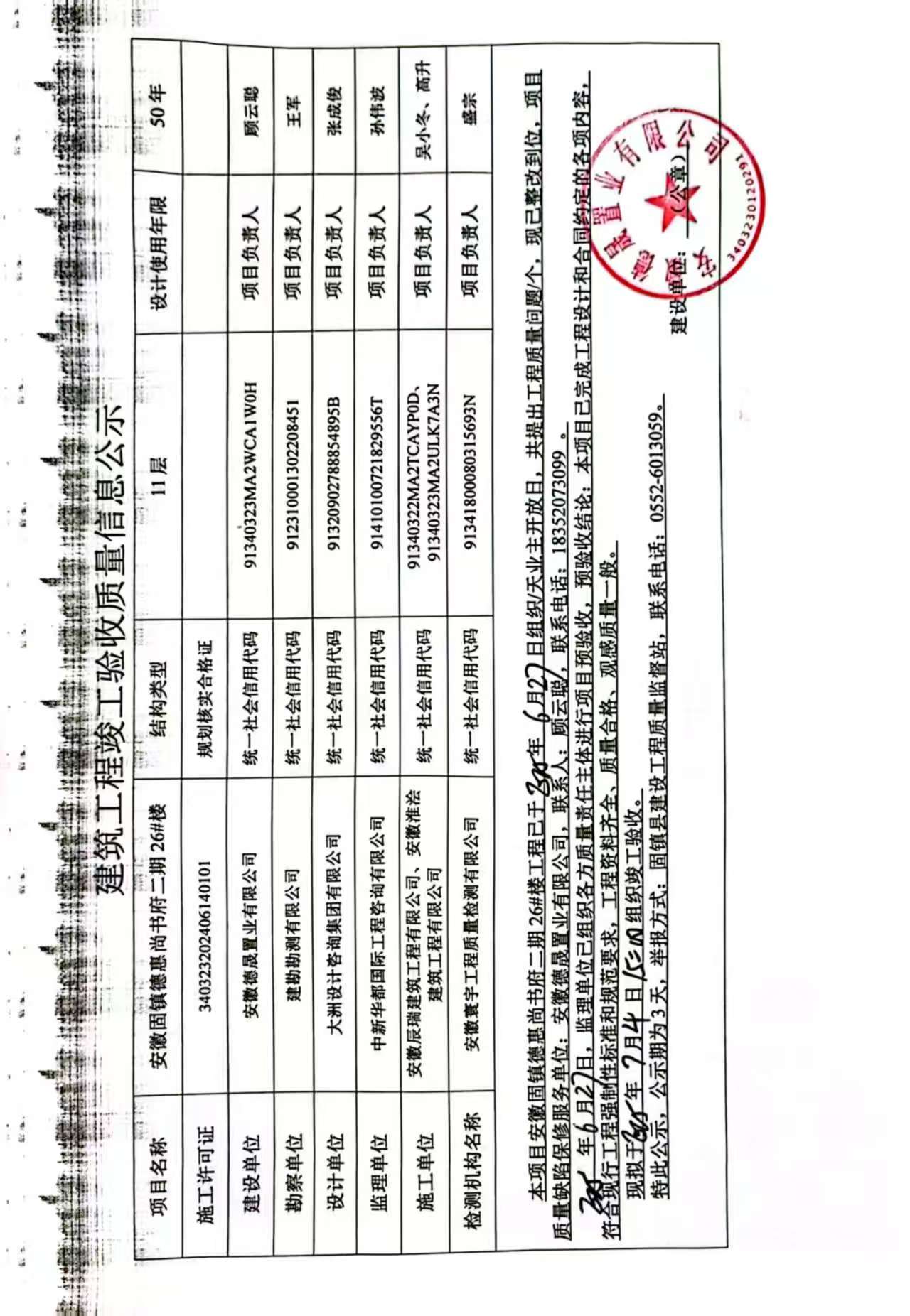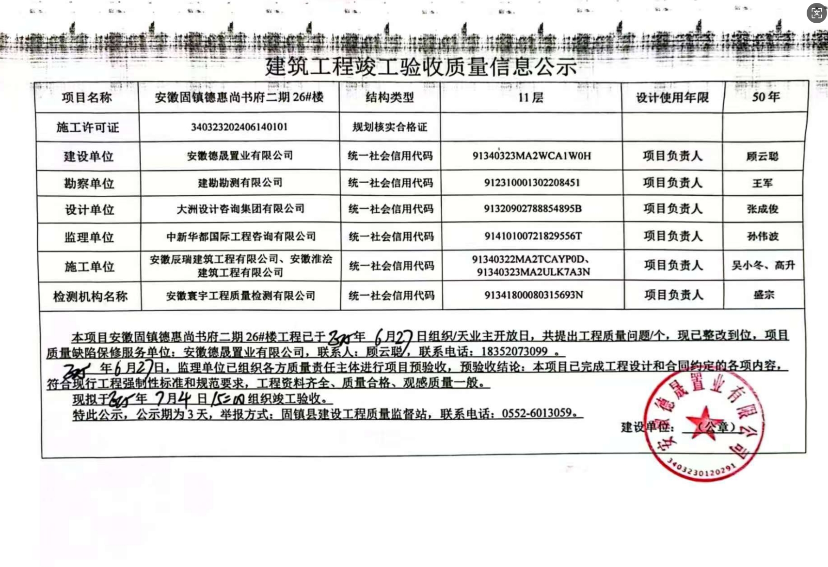 安徽固鎮德惠尚書府二期26#樓建筑工程竣工驗收質量信息公示